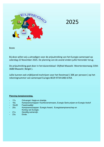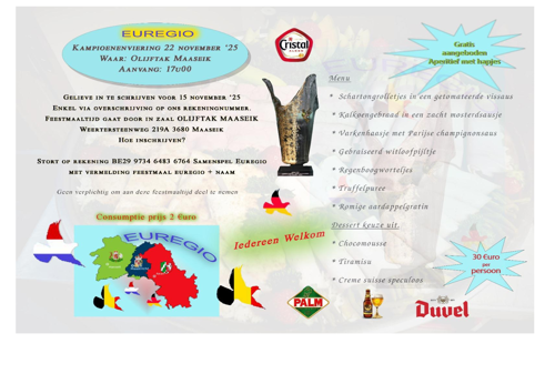 Op zaterdag 22 november leeft het samenspel Euregio zijn jaarlijks hoogtepunt met de kampioenenviering in de zaal van Olijftak in Maaseik. Inschrijven is noodzakelijk want alles is tot in de puntjes verzorgd door de Limburgse Fond & Marathon Club.