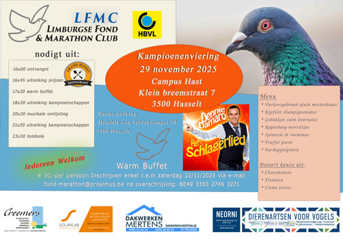 Zaterdag 29/11/2025 is het zover: de kampioenenviering van de Limburgse Fond & Marathon club, en dit in een nieuwe locatie, met name campus Hast. De LFMC Kampioenendag begint om 16 uur in Zaal Campus Hast (Kleine Breemstraat 7) in Hasselt. Uiteraard is er spijs en drank voorzien. Er is een ruime gratis parking (+/- 200 auto's) van school voorzien langs de Volvo-garage aan de Hendrik van Veldekesingel 39 (zie grondplan)