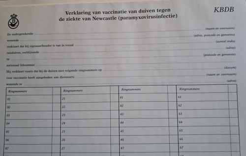 “Wij verklaren als vereniging te handelen in overeenkomst met art.17 van de Richtlijn 92/66/EG aangaande de verplichte enting tegen de ziekte van Newcastle. Bovendien zullen wij als vereniging controleren dat uitsluitend duiven die ingeënt zijn tegen de ziekte van Newcastle aanvaard worden voor de leer- en wedvluchten/tentoonstellingen die in haar schoot worden ingericht en ingekorfd tijdens het komende seizoen.”