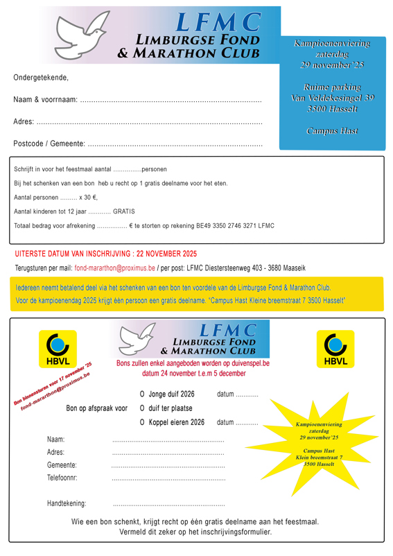 Deelname aan het feest kost 30 euro per persoon. Inschrijven kan tot en met zaterdag 22 november via email: fond-marathon@proximus.be na overschrijving op BE49 3350 2746 3271. Voor de bonschenkers voorziet de fondclub 1 gratis deelname per bon.